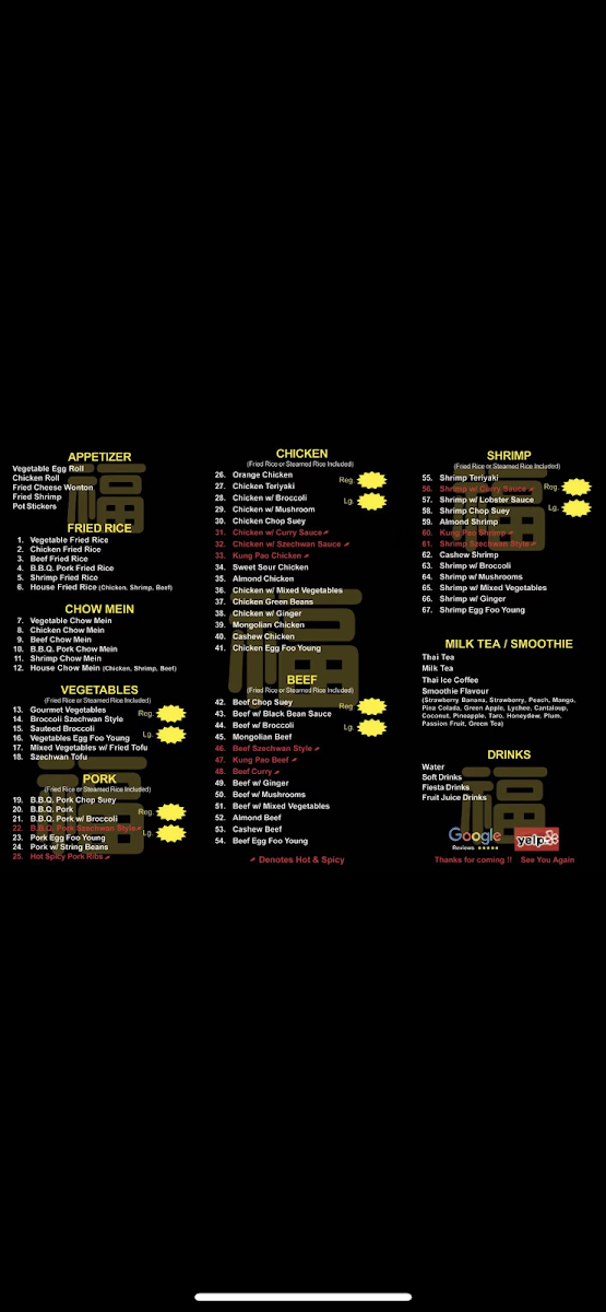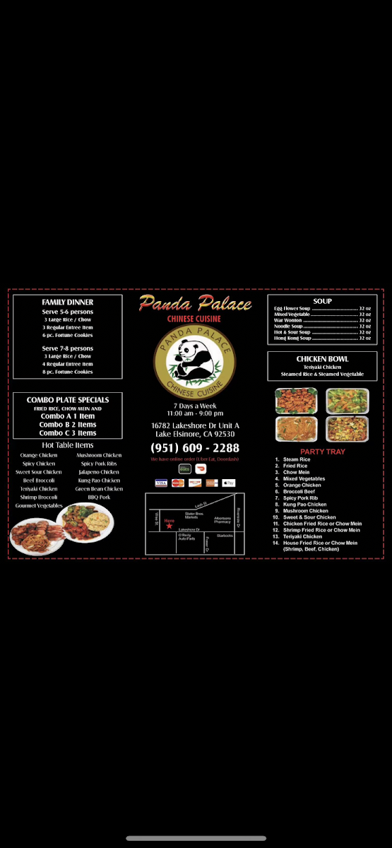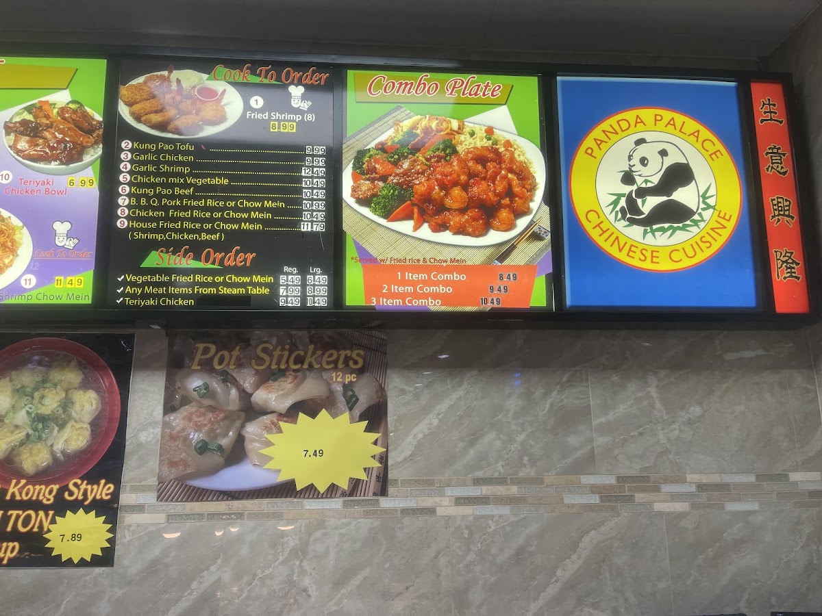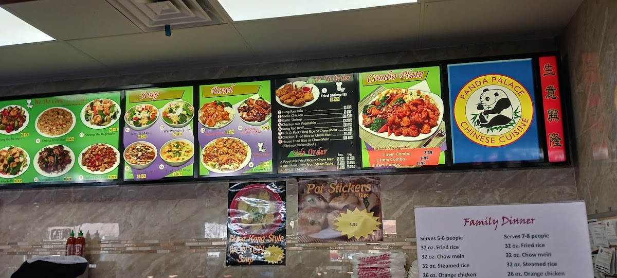 The menu at Panda Palace features a selection of Chinese and fast food items suitable for lunch, dinner, and quick casual meals. It provides a range of soups, entrees, and combo meals designed for individual servings or family-style dining.