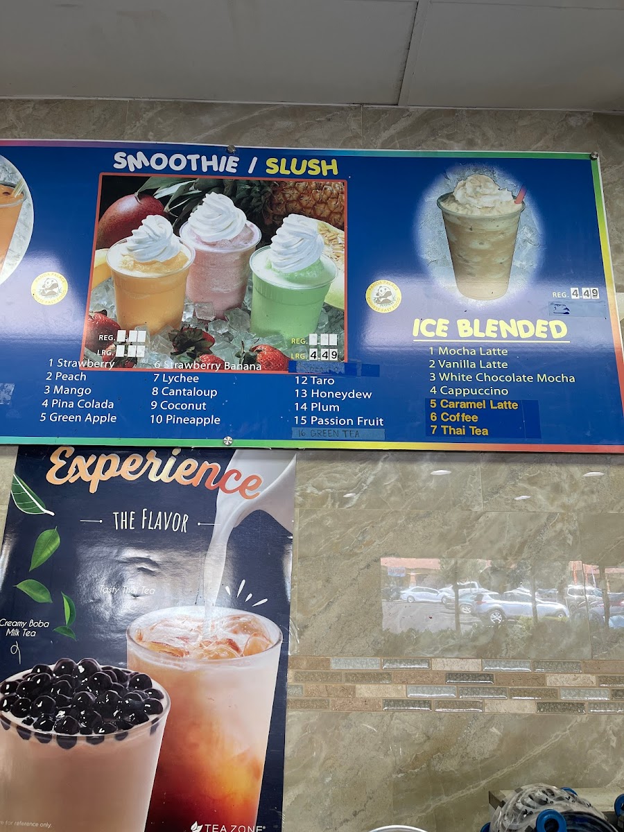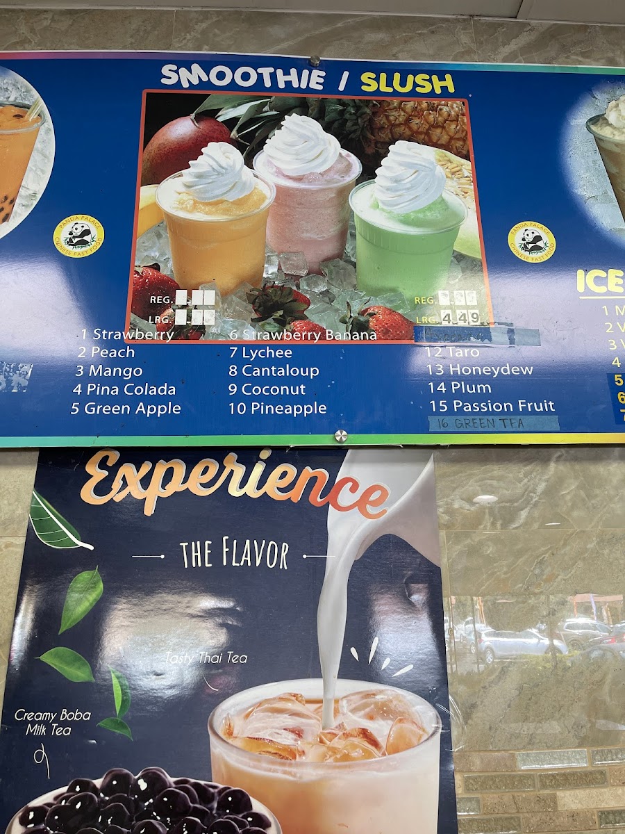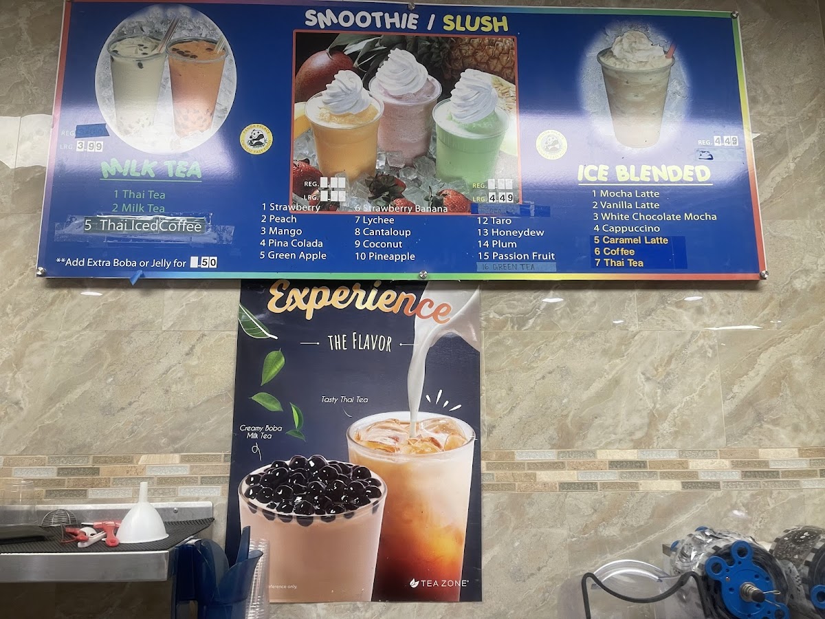 - Drinks: Beverage choices include Thai Tea and smooth/slush drinks.